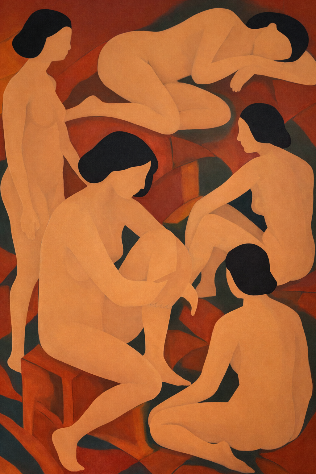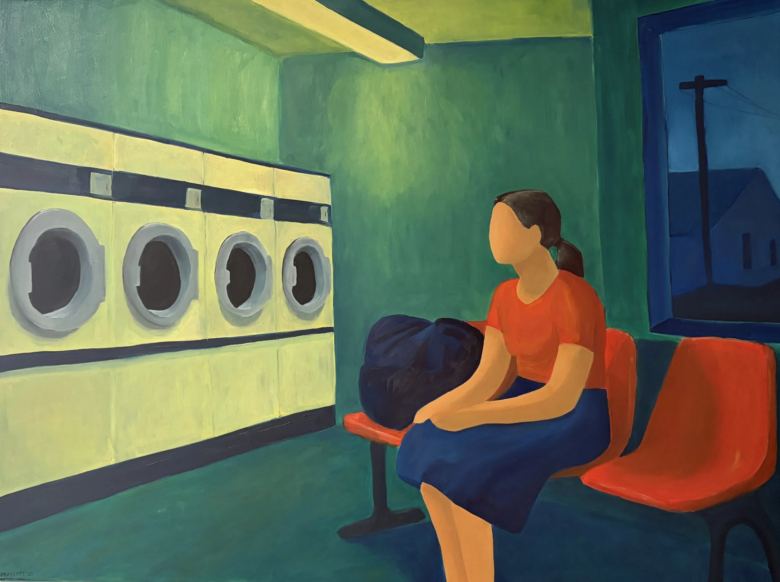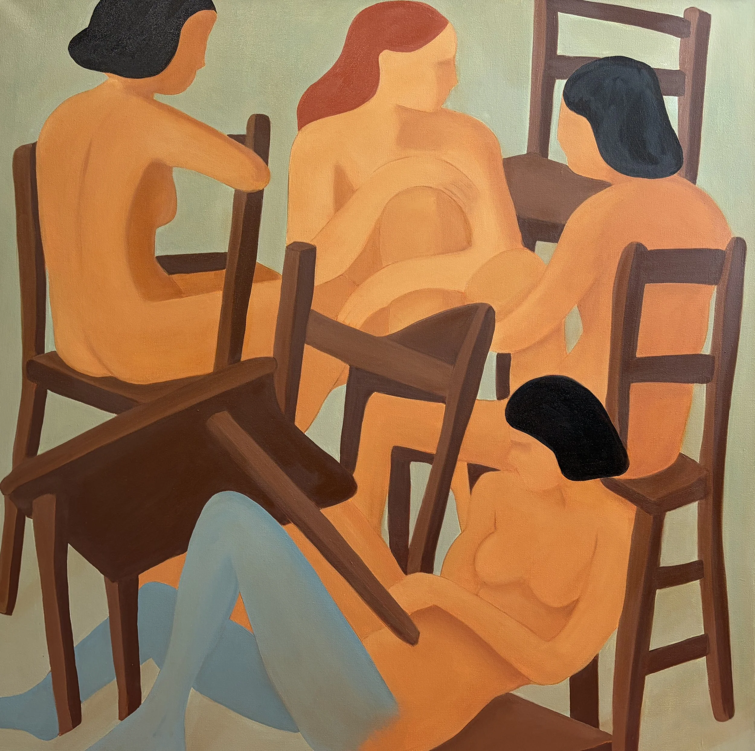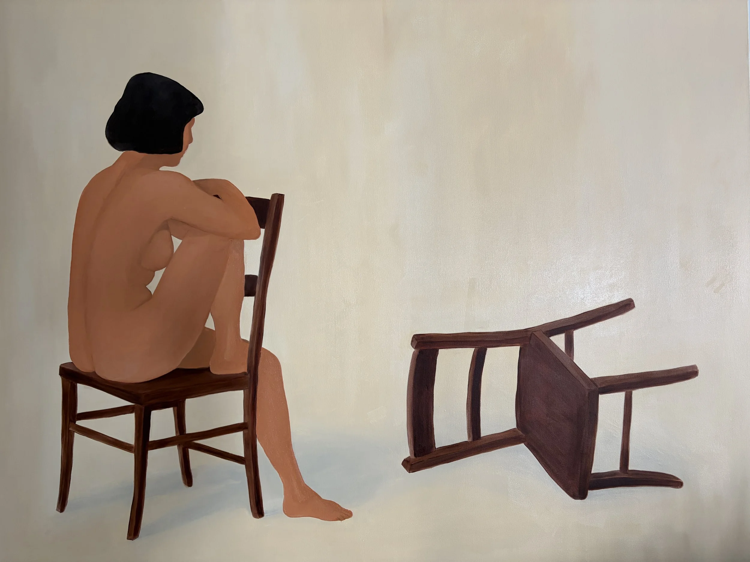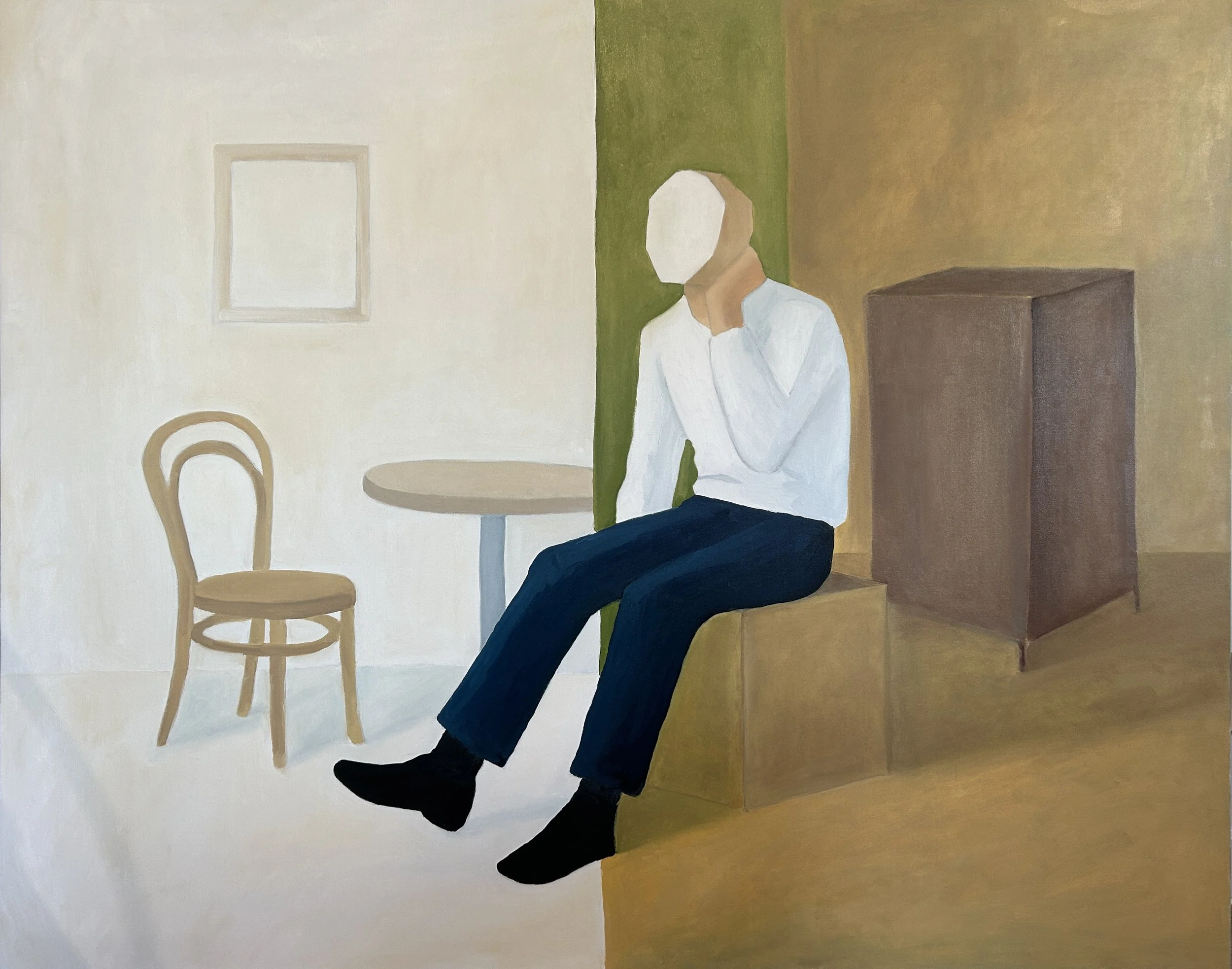 My work primarily examines the relationship between the body and constructed space. Figures are pared down, treated as structural elements within the composition rather than portraits. Identity is secondary to posture, weight, and placement. Chairs, walls, and architectural divisions function as organizing systems. They establish geometry, containment, and proximity, shaping how figures relate to one another. The spaces are compressed and flattened, emphasizing surface and color over depth. This flattening resists narrative resolution and instead foregrounds arrangement — who sits, who leans, who remains. Color operates atmospherically rather than descriptively. Large fields create psychological conditions that oscillate between intimacy and distance, stability and imbalance. These paintings propose the interior not as setting, but as structure — a framework within which presence, tension, and quiet coexist.